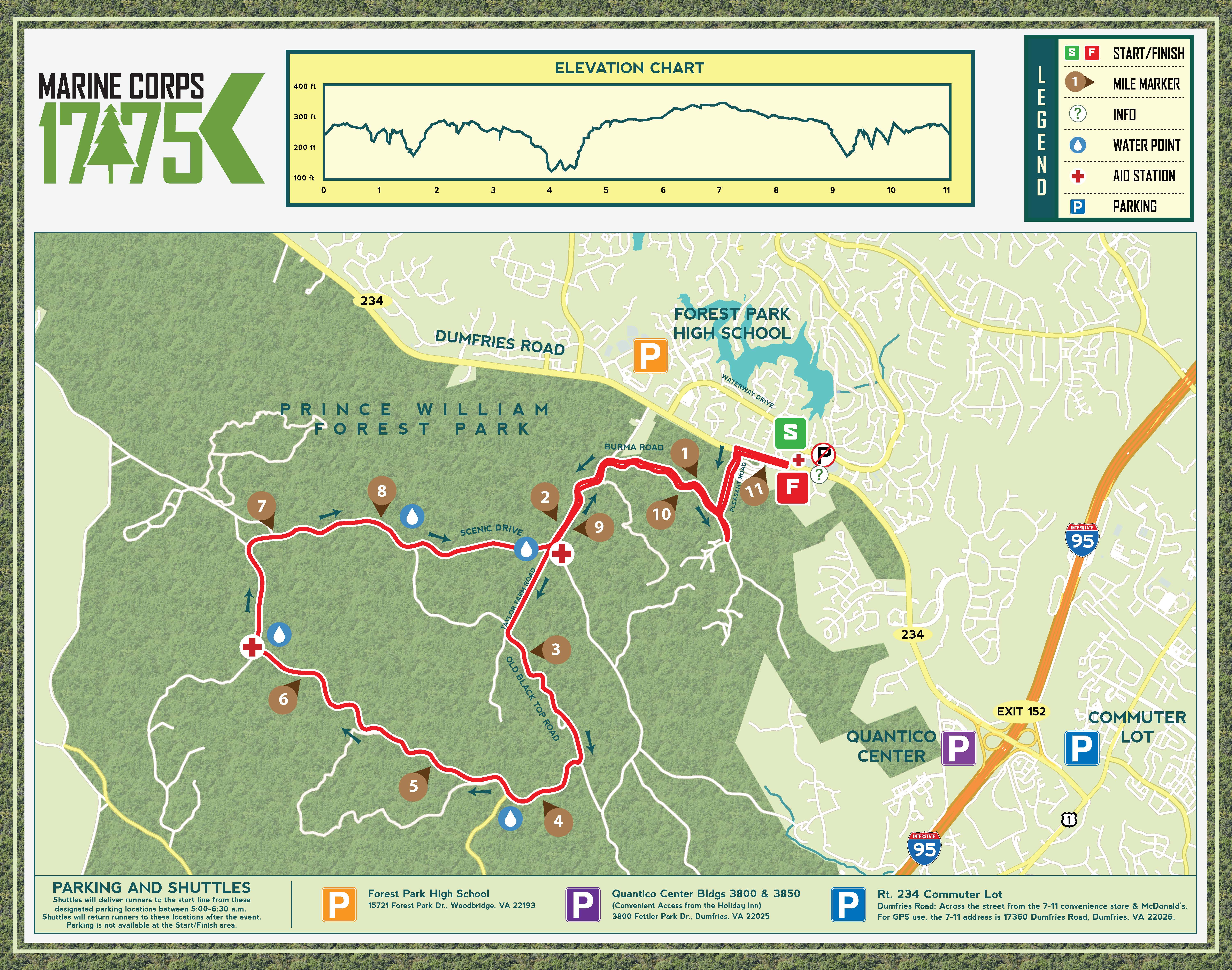 We will meet at the McDonald’s at 18050 Triangle Shopping Plaza, Dumfries, VA 22026 in the Triangle Plaza in Dumfries (Route 1, approximately 1 mile north of Joplin Road) at 0530. From there we will roll to the Prince William Forest Park. We must be on the course no later than 0630 for those on the course. Tom will need to be at the Start/Stop by 0415 (Sorry about that). The shuttles start running at 0500. The race starts at 0700.